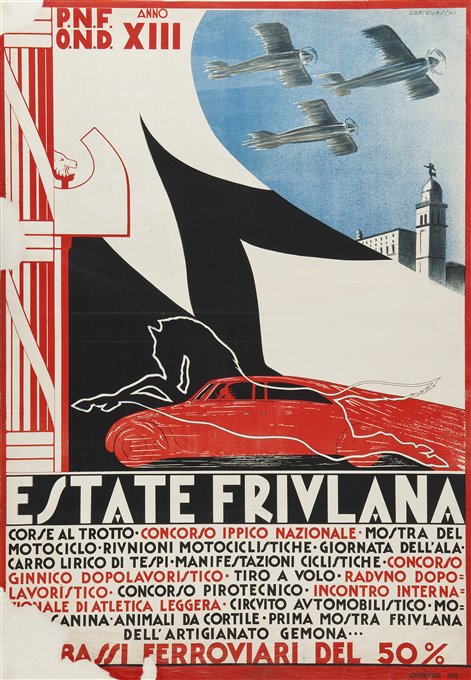 | Note | Manifesto realizzato da Ugo Grignaschi, artista nato a Grado nel 1887 , pittore di vedute, di ritratti, di composizioni religiose, affreschista. Attivo soprattutto a Grado, sua città natale, in Friuli e a Monaco di Baviera. Incorniciato dal fascio littorio, il manifesto è composto da una parte di testo, che propone il ricco programma delle attività dell'Estate Friulana, e da una parte illustrata che mostra elementi distintivi della cartellonistica degli anni '30 oltre all'eco di tendenze figurative europee: le convenzioni figurative prevedono così forme volumetriche, funzionali, sintetiche, chiaramente leggibili. I colori si fanno uniformi e compatti, mentre la composizione viene spesso costruita sull'asse diagonale. Immancabili i richiami al movimento e alla velocità: la scattante silhouette di un cavallo sovrapposta ad un'automobile rombante e tre audaci aerei - retaggio dell'aeropittura del secondo futurismo - che solcano il cielo udinese. Il manifesto è stato realizzato per la promozione dell'Estate Friulana, manifestazione promossa dal Partito Nazionale Fascista e dall'O.N.D. di Udine. La celebrazione delle forze aeree italiane ritorna anche nel manifesto del 1934 con tre monoplani stilizzati che solcano il cielo sopra uno scorcio del Castello e del campanile della Chiesa di S.Maria. In questo esemplare, la varietà delle manifestazioni pubblicizzate ha richiesto una complessa e retorica scenografia: accanto al fascio littorio (con la consueta sigla Partito Nazionale Fascista, Opera Nazionale Dopolavoro), vi è lo scaglione dello stemma di Udine, distorto in una fascia ricurva che si fonde con la raffigurazione grafica di una silhouette equina in corsa, a sua volta, sovrapposta ad un elegante bolide a quattro ruote (il prototipo della fiat 1100 mille miglia, che entra in produzione nel ‘38). Stilisticamente nella figura dell’automobile si nota una nascente tendenza alla stilizzazione e alla ricerca della rappresentazione del dinamismo, che sotto l’influsso delle avanguardie, parzialmente tocca anche la nostra regione, si veda la bella prova di Tullio Crali del 1933 per il I campionato interprovinciale di radiomotociclismo a Gorizia, con una geometrizzante figura di pilota che si