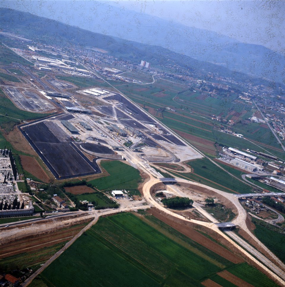 Veduta aerea della stazione confinaria S. Andrea in costruzione, a ridosso del confine tra Italia e Jugoslavia (ora Slovenia) nella frazione di Sant’Andrea/Štandrež nel comune di Gorizia, via Trieste e la rotonda in costruzione |