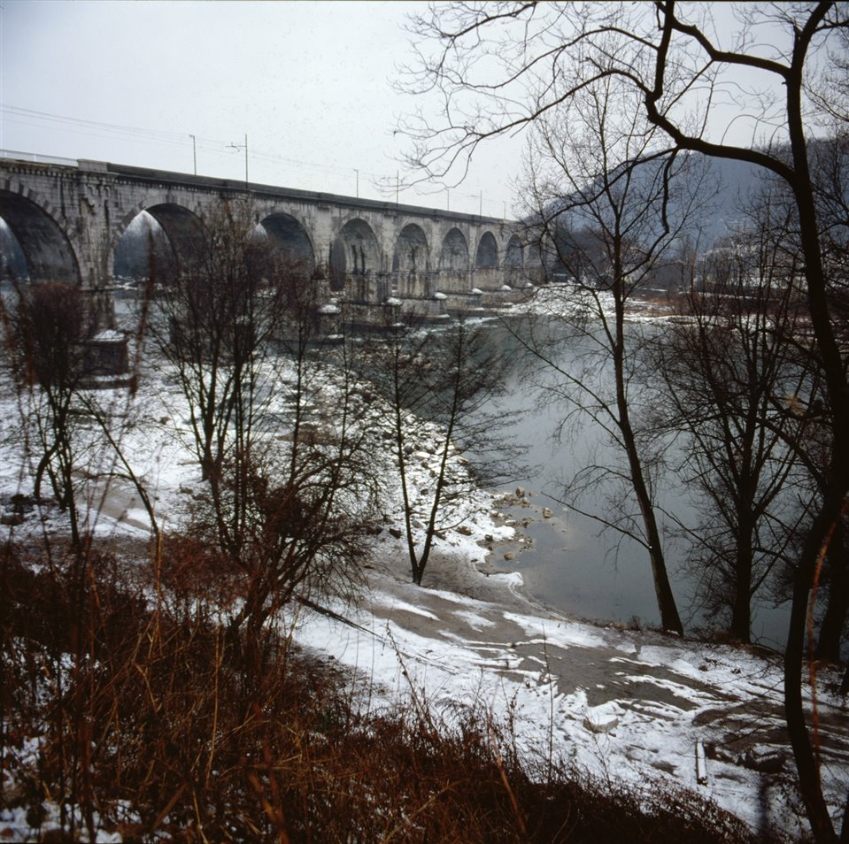 Fiume Isonzo e il ponte ferroviario della linea ferroviaria Udine-Trieste visto da Lungo Isonzo Argentina, nel Centro Cittadino a sud |