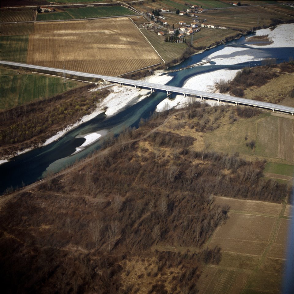 Veduta aerea del fiume Isonzo con il ponte dell’autostrada A34 Villesse-Gorizia e la frazione di Mainizza nel comune di Farra d’Isonzo |
