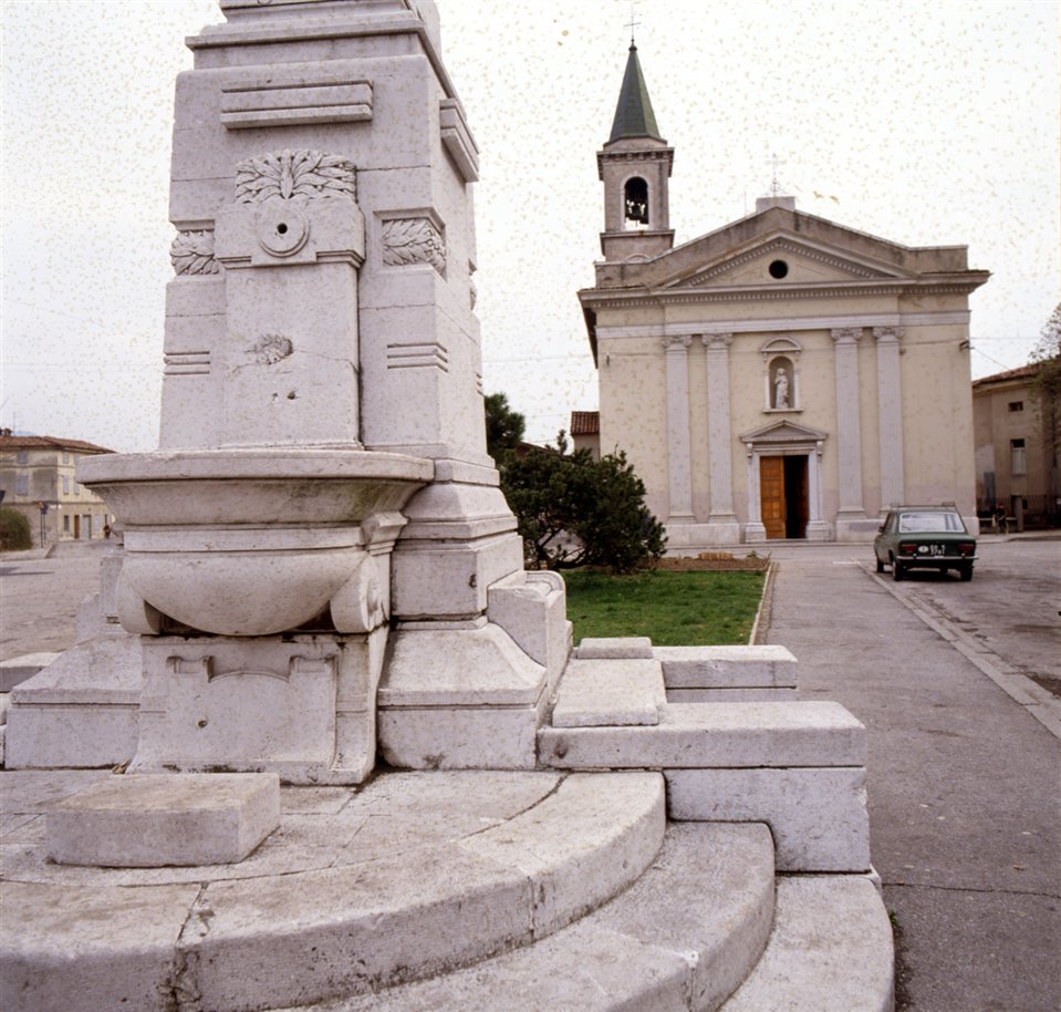Particolare della fontana/obelisco in via Parcar; sullo sfondo la chiesa di San Rocco |