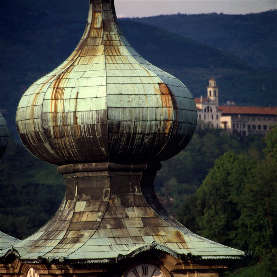 Particolare del campanile della chiesa di Sant’Ignazio; sullo sfondo la chiesa e il convento della Castagnevizza |