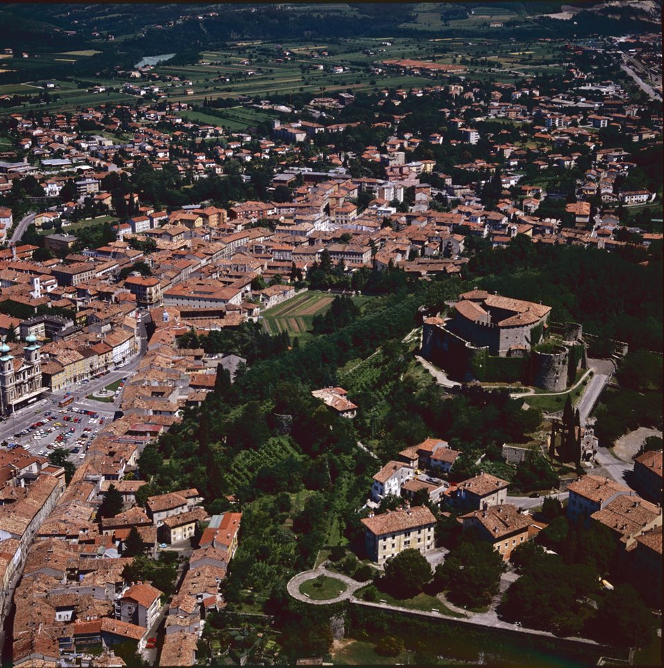 Veduta aerea del Castello di Gorizia e del Centro Cittadino (Borgo Castello); a sinistra piazza della Vittoria con la chiesa di Sant’Ignazio e il quartiere Montesanto-Piazzutta |