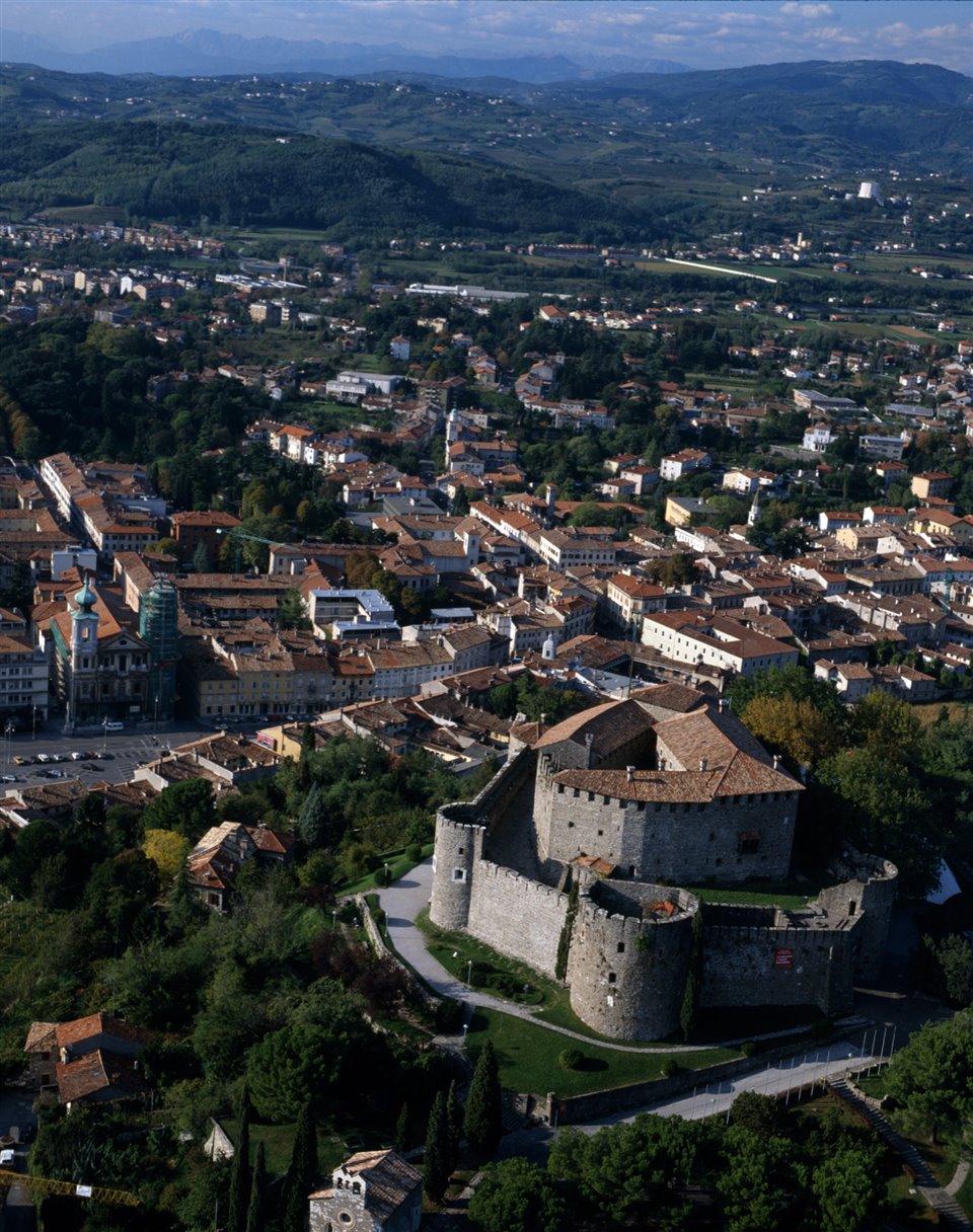 Veduta aerea del Castello e parte del Borgo Castello da est a ovest. Si vede piazza della Vittoria e parte del Centro storico |