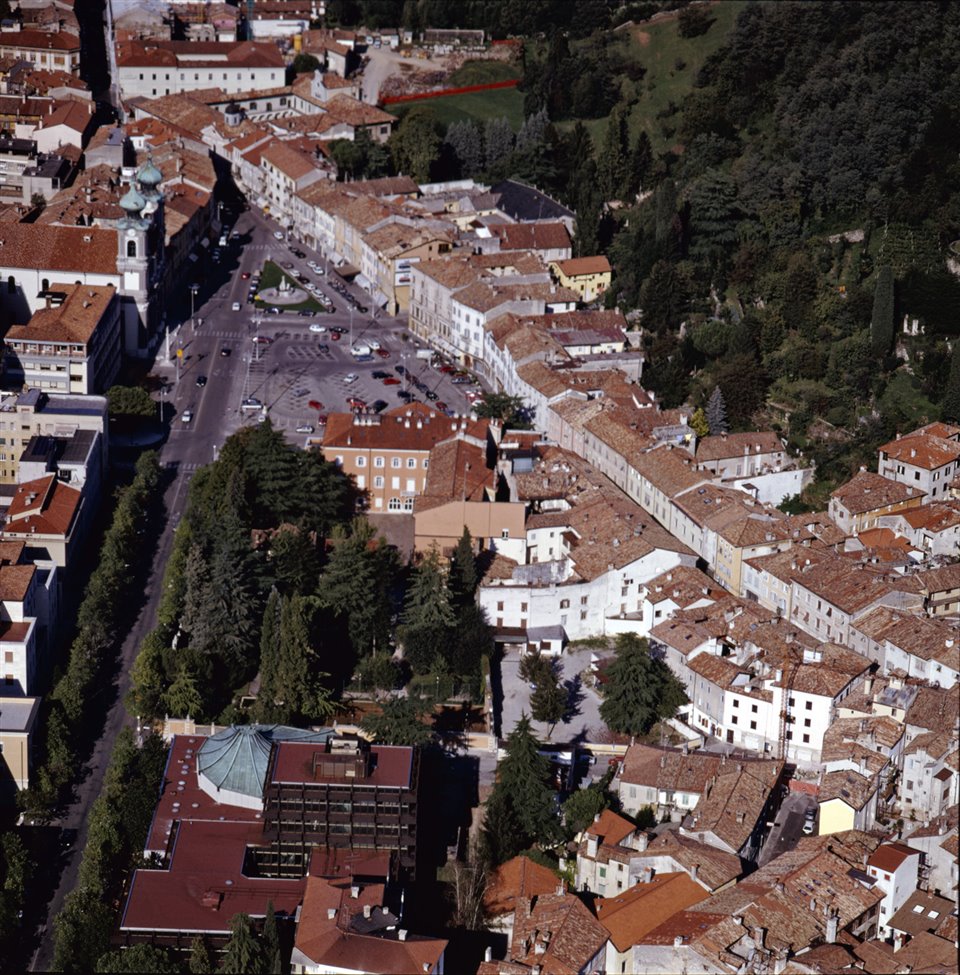 | Soggetto | Veduta aerea del Centro Cittadino con piazza della Vittoria, la chiesa di Sant’Ignazio e il Palazzo della Torre (Prefettura). Sulla sinistra via Roma e una parte del Palazzo della Regione e sulla destra via Rastello; sul fondo Palazzo Cobenzl (Arcivescovado) |