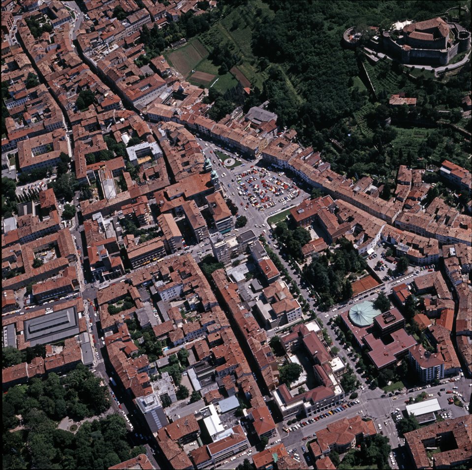| Soggetto | Veduta aerea di una parte del Centro Cittadino via Carducci, con piazza della Vittoria, la chiesa di Sant’Ignazio e il Palazzo della Torre (Prefettura), via Roma con il Palazzo della Regione, via Oberdan; in alto a destra il Castello di Gorizia |