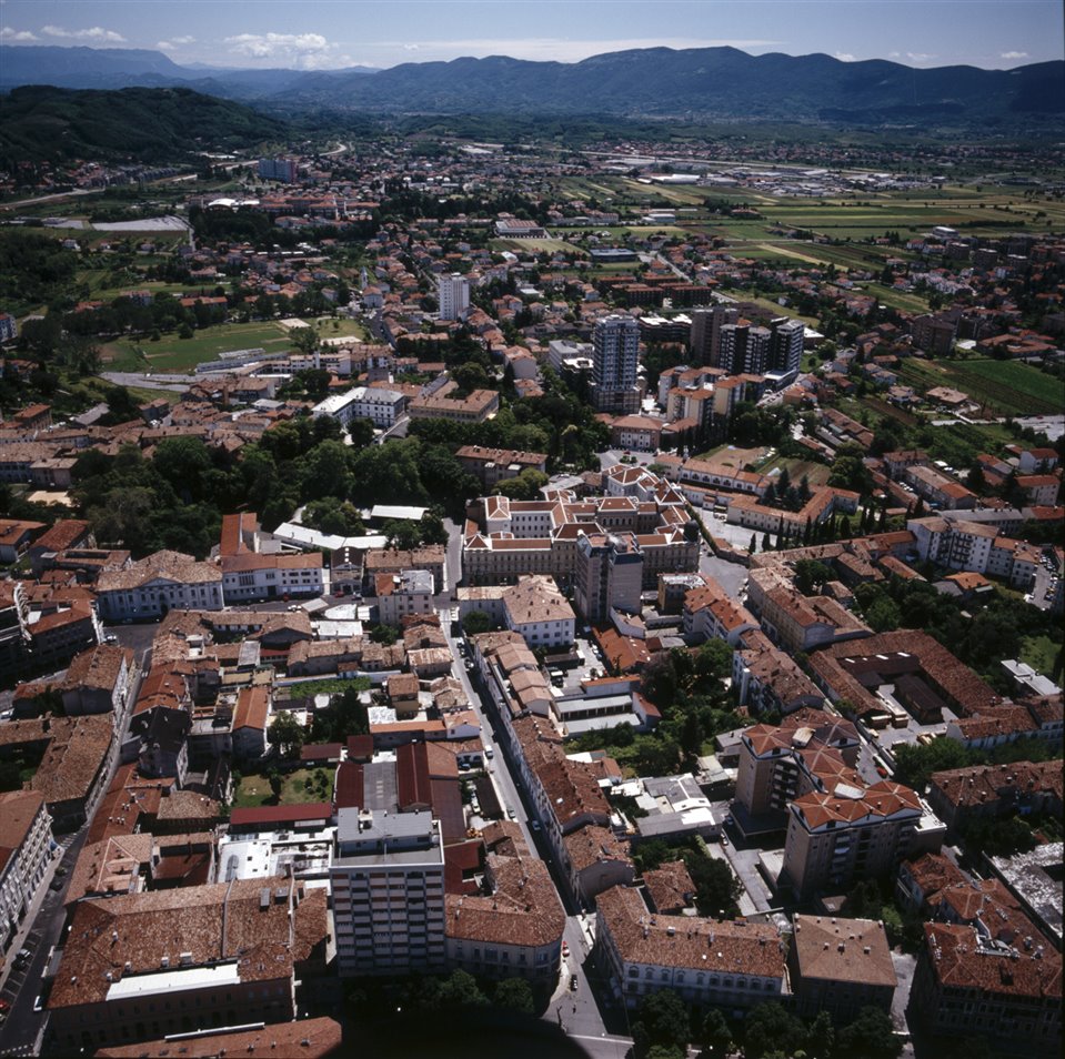 | Soggetto | Veduta aerea di parte del Centro storico con il parco del Municipio, Palazzo Attems-Santa Croce (Comune), Palazzo di Giustizia, un tratto di via Garibaldi, piazza del Municipio, via Cascino e via XXIV Maggio. In fondo il Carso |