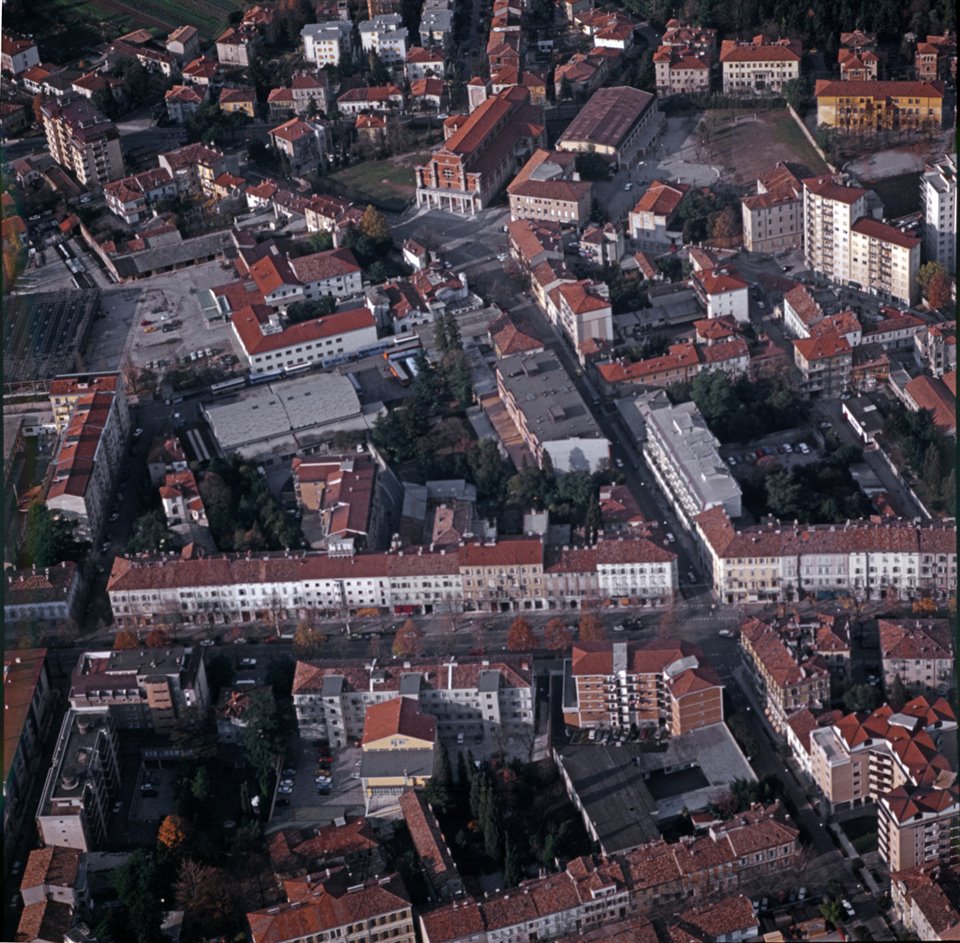 | Soggetto | Veduta aerea di una parte del Centro storico con un tratto di Corso Verdi, via IX Agosto e un tratto di Via Brigata Casale. Al centro l’ex stazione delle corriere e in alto la Stella Mattutina con la chiesa del Sacro Cuore di Gesù e Maria |