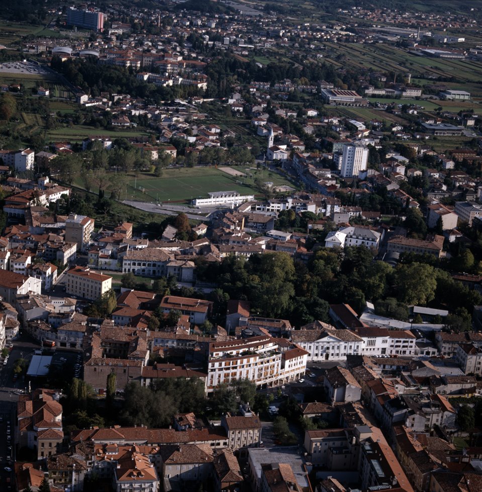 Veduta aerea di parte del Centro storico con piazza del Municipio, Palazzo Attems-Santa Croce (Comune) e un tratto di via de Gasperi. In alto il campo sportivo “Baiamonti” e il quartiere Borgo San Rocco |