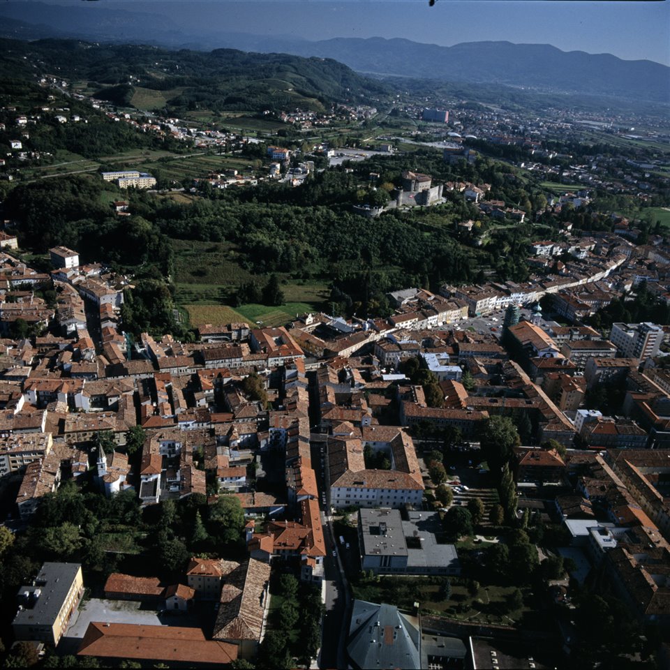 Veduta aerea del Centro Cittadino e del quartiere Montesanto-Piazzutta con il Castello di Gorizia, piazza della Vittoria, al centro via del Seminario e il Seminario Maggiore; in primo piano a sinistra l’attuale Istituto Statale di Istruzione Secondaria Superiore “Gabriele D’Annunzio”; sullo sfondo il confine tra Italia e Jugoslavia (ora Slovenia) |