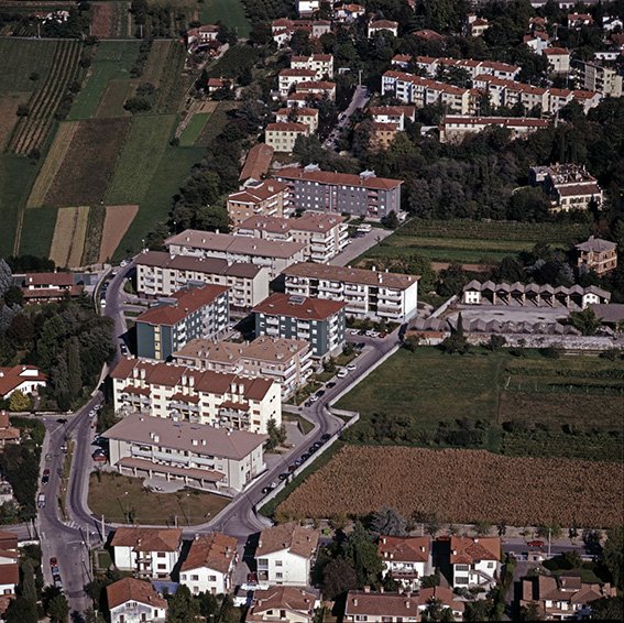| Soggetto | Veduta del quartiere Montesanto-Piazzutta con via S. Angela Merici, via Palladio, via Rocca, via Michelstaedter, via della Levada, via Capellaris, via Brigata Etna, l’ex deposito legname e falegnameria del Corpo Forestale e la Villa Frommer |
