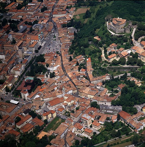 Veduta aerea del Centro Cittadino con il Castello di Gorizia e il Centro Cittadino (Borgo Castello); sulla sinistra via Roma, piazza della Vittoria con la chiesa di Sant’Ignazio. Al centro via Rastello e la chiesa metropolitana dei Santi Ilario e Taziano (Duomo) e sulla destra piazza Sant’Antonio |