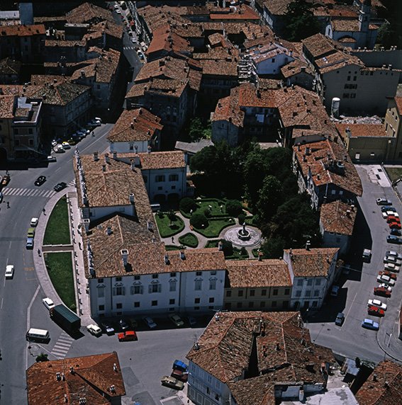 Veduta aerea di parte del Centro storico con il Palazzo Attems-Petzenstein (Musei Provinciali) in piazza De Amicis, un tratto di via Carducci e di via Ascoli |