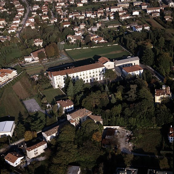 Veduta aerea di parte del quartiere Montesanto-Piazzutta con il centro giovanile “San Luigi” ex Scuola-Collegio Salesiani di via Don Bosco, via dei Campi, via della Levada, via Buffolini e via Gibelli |