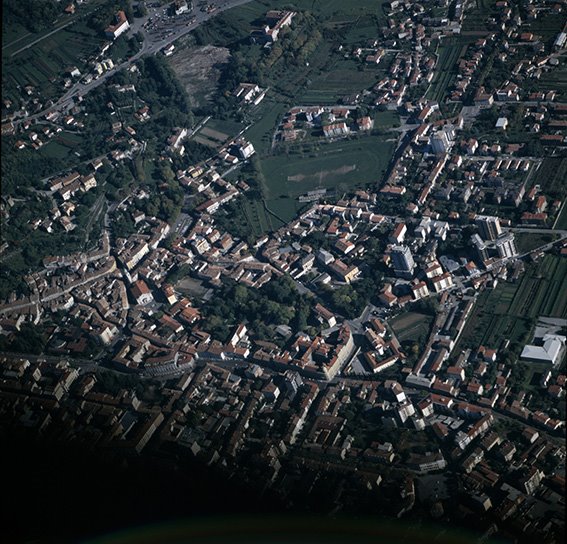 Veduta aerea verso est con il quartiere Borgo San Rocco fino al piazzale della Casa Rossa |