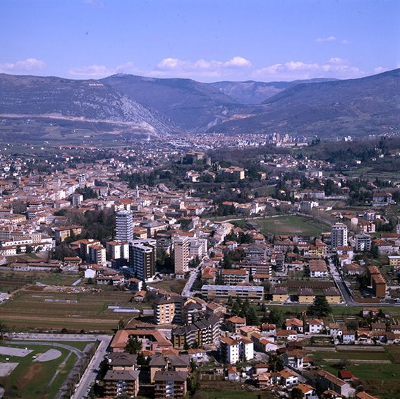 Veduta aerea della periferia est dei quartieri Borgo San Rocco e Sant’Anna con un tratto di via Garzarolli |