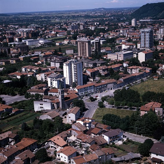 Veduta aerea del quartiere Borgo San Rocco con la chiesa di San Rocco, via Parcar, un tratto di via dei Lantieri e un tratto di via Lunga |