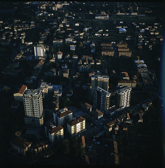 Veduta aerea dei quartieri Borgo San Rocco e Sant’Anna con un tratto di via dei Faiti e via Vittorio Veneto |