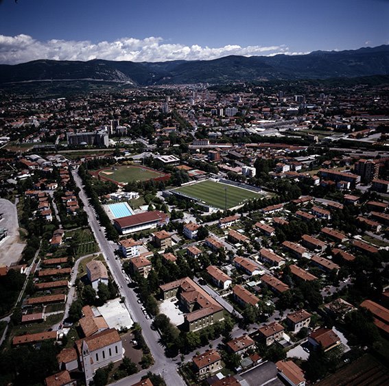 | Soggetto | Veduta aerea della periferia sud con al centro il campo sportivo scolastico “Fabretto”, lo stadio della Campagnuzza, la Piscina Comunale di Gorizia, l’Ospedale San Giovanni di Dio dei Fatebenefratelli (ora Ospedale di Gorizia), il piazzale Divisione Mantova e un tratto della linea ferroviaria Udine-Trieste con la stazione di Gorizia Centrale. Sulla sinistra in basso via della Campagnuzza con la chiesa Madonna della Misericordia, il piazzale Don Manzin, un tratto di Via Pola e la Scuola Primaria “Giovanni Ferretti”. Sullo sfondo a destra il Monte San Gabriele e a sinistra il Monte Sabotino |