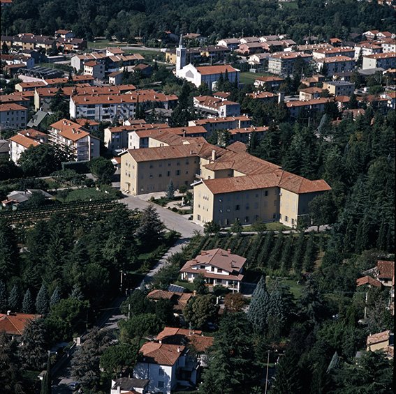 Veduta aerea del Convento Suore della Provvidenza ora “Il Nazareno”, la chiesa di San Giuseppe Artigiano a Straccis e un tratto di Via Borsi |