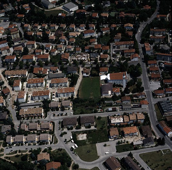Veduta aerea del quartiere di Straccis con la chiesa di San Giuseppe Artigiano e un tratto di Via Brigata Pavia, un tratto di via dei Torriani |