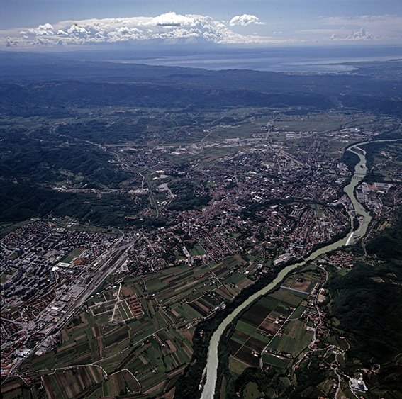 Veduta aerea della zona di Gorizia con il fiume Isonzo; in basso sulla sinistra la città di Nova Gorica e la linea ferroviaria Transalpina con il confine tra Italia e Jugoslavia (ora Slovenia) e l'area delle Casermette; al centro la città di Gorizia e sullo sfondo il golfo di Panzano |