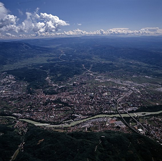 Veduta aerea di Gorizia e del fiume Isonzo. In basso una parte del Monte Calvario, la zona industriale di Piedimonte del Calvario/Podgora e il quartiere di Straccis; sulla destra il ponte VIII Agosto, il viadotto “Ragazzi del ‘99” e la linea ferroviaria Udine-Trieste con il ponte ferroviario; sullo sfondo parte del territorio jugoslavo (ora sloveno) |