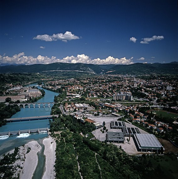 Veduta aerea del fiume Isonzo con il quartiere Campagnuzza, il Centro Cittadino a sud. Sulla sinistra la zona industriale di Piedimonte del Calvario/Podgora, la linea ferroviaria Udine-Trieste con il ponte ferroviario, il ponte VIII Agosto e la traversa (Diga) di Gorizia. Sulla destra l’Ospedale San Giovanni di Dio dei Fatebenefratelli (ora Ospedale di Gorizia) e più in basso il quartiere fieristico e il campo sportivo scolastico “Fabretto”; sul fondo il Monte San Gabriele e il Monte Sabotino |