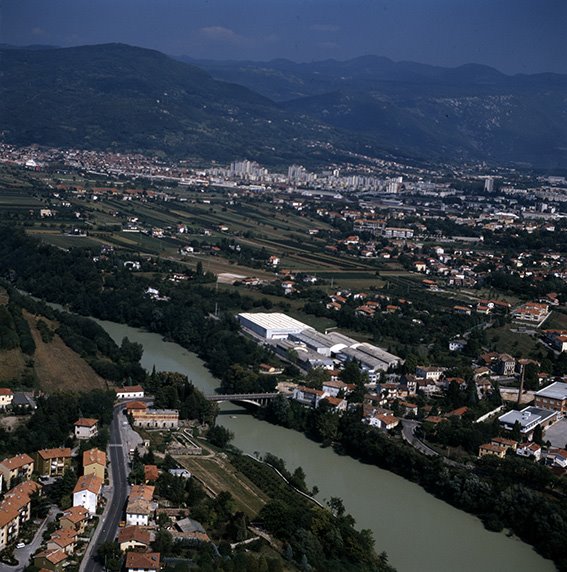 Veduta aerea di parte del quartiere di Straccis con via Ponte del Torrione, il ponte del Torrione (anche ponte di Piuma/Pevma) sul fiume Isonzo, l’ex Manifattura Tabacchi e le Officine Meccanotessili Vouk; sul fondo Nova Gorica in Jugoslavia (ora Slovenia), l'area delle Casermette e il Monte San Gabriele |
