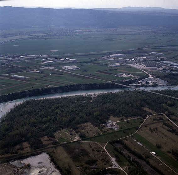 Veduta aerea del fiume Isonzo con il ponte di via Cecotti nella frazione di Sant’Andrea/Štandrež nel comune di Gorizia e in basso la cava di ghiaia di Sant’Andrea/Štandrež. Al centro un tratto della strada statale 55, l’aeroporto di Gorizia “Amedeo Duca d’Aosta” (in località Merna) e sullo sfondo il Carso |