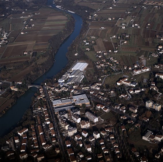 Veduta aerea di parte del quartiere di Straccis con il fiume Isonzo, il ponte del Torrione (anche ponte di Piuma/Pevma), l’ex Manifattura Tabacchi e le Officine Meccanotessili Vouk |