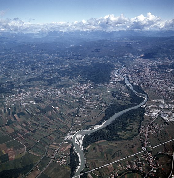 Veduta aerea panoramica del territorio di Gorizia con il fiume Isonzo, la città di Gorizia sulla destra, l’abitato di Savogna d’Isonzo/Sovodnje ob Soči in basso, la frazione di Lucinico nel comune di Gorizia, l’abitato di Mossa, il Monte Calvario e il Collio al centro. In fondo il Monte Sabotino, il Monte Santo, il Monte San Gabriele e le Prealpi Giulie