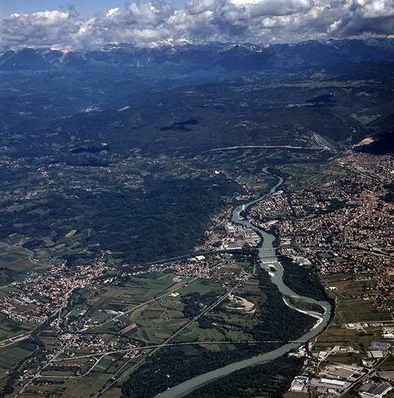 Veduta aerea della zona di Gorizia con il fiume Isonzo, a sinistra la frazione di Lucinico nel comune di Gorizia con il Monte Calvario e il Collio. Al centro la frazione di Piedimonte del Calvario/Podgora nel comune di Gorizia con il ponte ferroviario, il ponte VIII Agosto e la traversa (Diga) di Gorizia; sul fondo il Monte Sabotino con la strada di Osimo e le Prealpi Giulie. In primo piano il ponte dell’autostrada A34 Villesse-Gorizia |