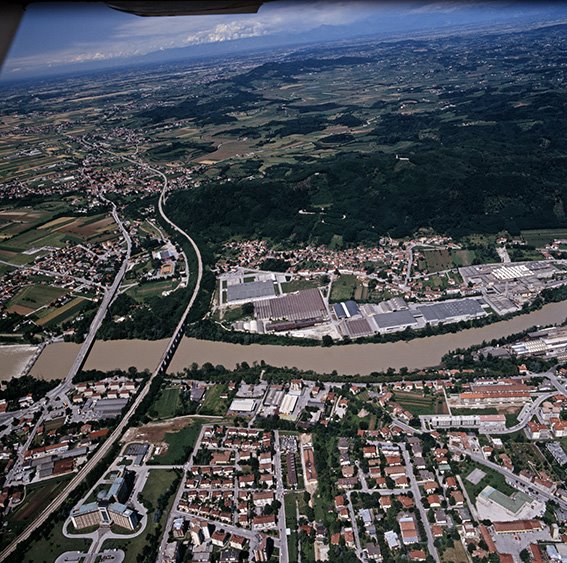 Veduta aerea del Centro Cittadino a sud con il Monte Calvario, la piana del Preval, le frazioni di Lucinico e il quartiere Madonnina del Fante, il fiume Isonzo, la zona industriale di Piedimonte del Calvario/Podgora con l’ex Cotonificio. In basso a sinistra l’Ospedale San Giovanni di Dio dei Fatebenefratelli (ora Ospedale di Gorizia), il ponte VIII Agosto, il viadotto “Ragazzi del ‘99”, la traversa (Diga) di Gorizia e la linea ferroviaria Udine-Trieste con il ponte ferroviario