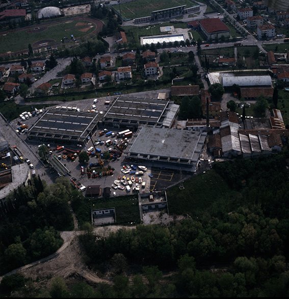 Veduta aerea del quartiere fieristico nel quartiere di Campagnuzza; in alto parte del campo sportivo scolastico “Fabretto” e dello stadio della Campagnuzza con via della Campagnuzza e via Capodistria |