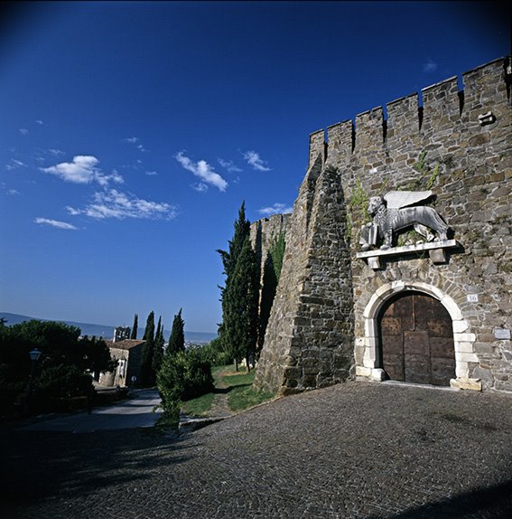 Centro Cittadino (Borgo Castello): ingresso principale del Castello di Gorizia con il leone di San Marco; in fondo la chiesa di Santo Spirito |