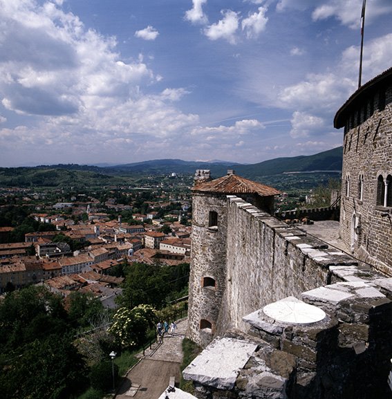 Il Centro Cittadino dalla cinta muraria del Castello di Gorizia con la Torre dell’Orologio; in fondo sulla sinistra il Monte Calvario e al centro le Prealpi Giulie |
