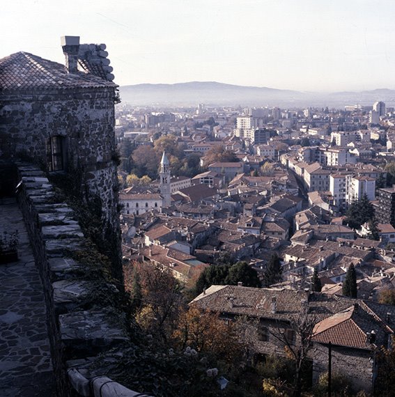 Il Centro Cittadino dalla cinta muraria del Castello di Gorizia, in prossimità della Torre dell’Orologio; in primo piano la chiesa metropolitana dei Santi Ilario e Taziano (Duomo) e sullo sfondo il Carso |