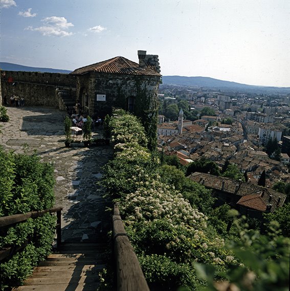 Centro Cittadino visto dalla cinta muraria del Castello di Gorizia con la Torre dell’Orologio; in basso la chiesa metropolitana dei Santi Ilario e Taziano (Duomo) e sullo sfondo il Carso |