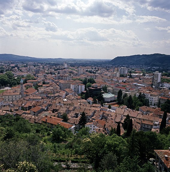 Centro Cittadino dal Castello di Gorizia con la chiesa metropolitana dei Santi Ilario e Taziano (Duomo) e sulla destra il Palazzo della Regione in via Roma |