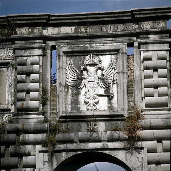 Particolare con l’aquila bicipite e iscrizione latina sulla trabeazione della Porta Leopoldina nel Centro Cittadino (Borgo Castello) |