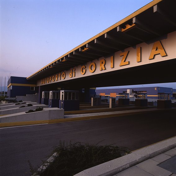 Ingresso dell’autoporto di Gorizia nella frazione di Sant’Andrea/Štandrež nel comune di Gorizia a ridosso del confine tra Italia e Jugoslavia (ora Slovenia) |