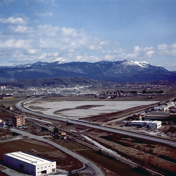 Veduta aerea dell’area occupata dall’autoporto di Gorizia prima della sua costruzione nella frazione di Sant’Andrea/Štandrež nel comune di Gorizia, la stazione confinaria S. Andrea a ridosso del confine tra Italia e Jugoslavia (ora Slovenia), il Cimitero Centrale e la linea ferroviaria Udine-Trieste |