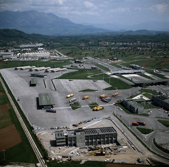 Veduta aerea della stazione confinaria S. Andrea in costruzione, a ridosso del confine tra Italia e Jugoslavia (ora Slovenia), nella frazione di Sant’Andrea/Štandrež nel comune di Gorizia |