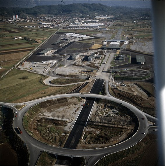 Veduta aerea della stazione confinaria S. Andrea, a ridosso del confine tra Italia e Jugoslavia (ora Slovenia), nella frazione di Sant’Andrea/Štandrež nel comune di Gorizia e la rotonda, entrambe in costruzione |