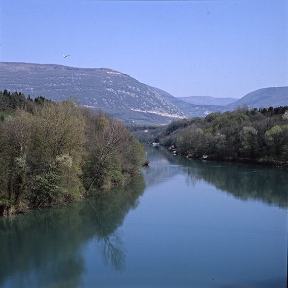 Fiume Isonzo dal ponte del Torrione (anche ponte di Piuma/Pevma) verso il Monte Sabotino |