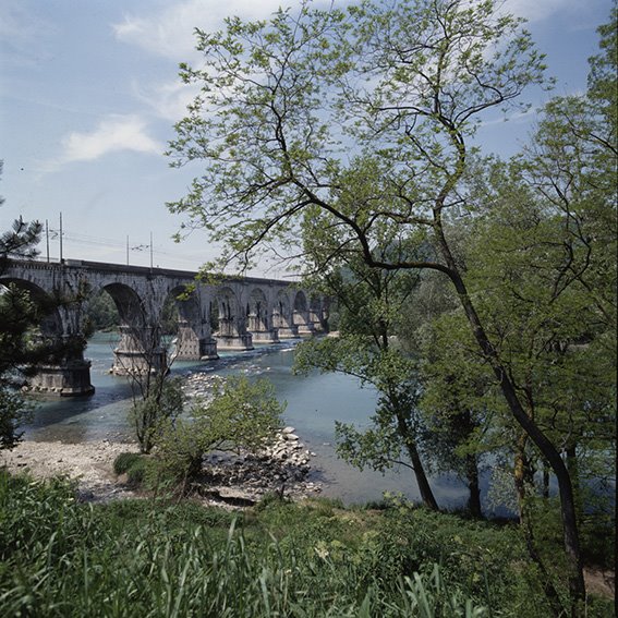 Fiume Isonzo e il ponte ferroviario della linea ferroviaria Udine-Trieste visto da lungo Isonzo Argentina, nel Centro Cittadino a sud |