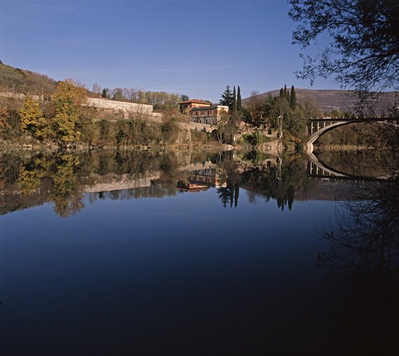 Fiume Isonzo, da sotto via dei Cordaioli, con l’attuale parco Piuma-Isonzo e il ponte del Torrione (anche ponte di Piuma/Pevma) nel quartiere di Straccis |