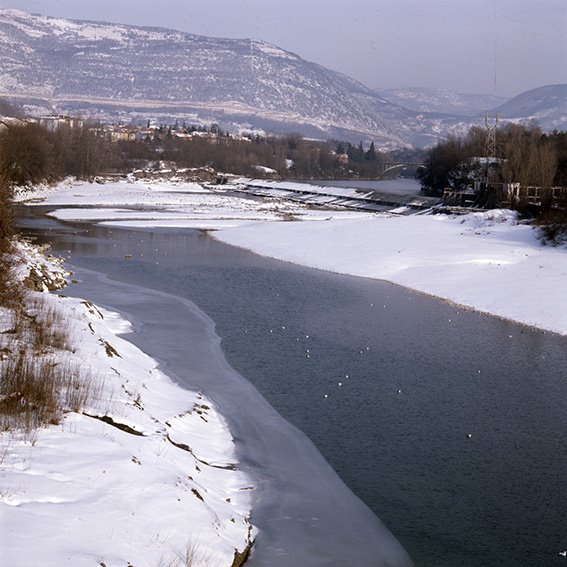 Fiume Isonzo dalla frazione di Piedimonte del Calvario/Podgora nel comune di Gorizia; sul fondo la traversa (Diga) di Straccis e il ponte del Torrione (anche ponte di Piuma/Pevma) |