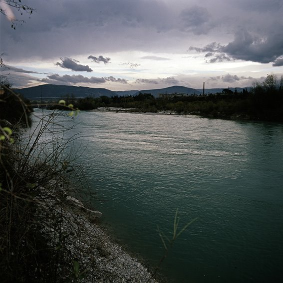 Fiume Isonzo dal quartiere di Madonnina del Fante verso il quartiere di Campagnuzza; sul fondo il ponte ferroviario della linea ferroviaria Udine-Trieste |
